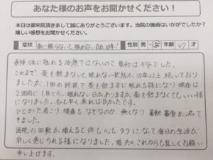 又、先生のお話も分かりやすく、施術と合わせて不安などの自律神経の不調も消えて行きました。