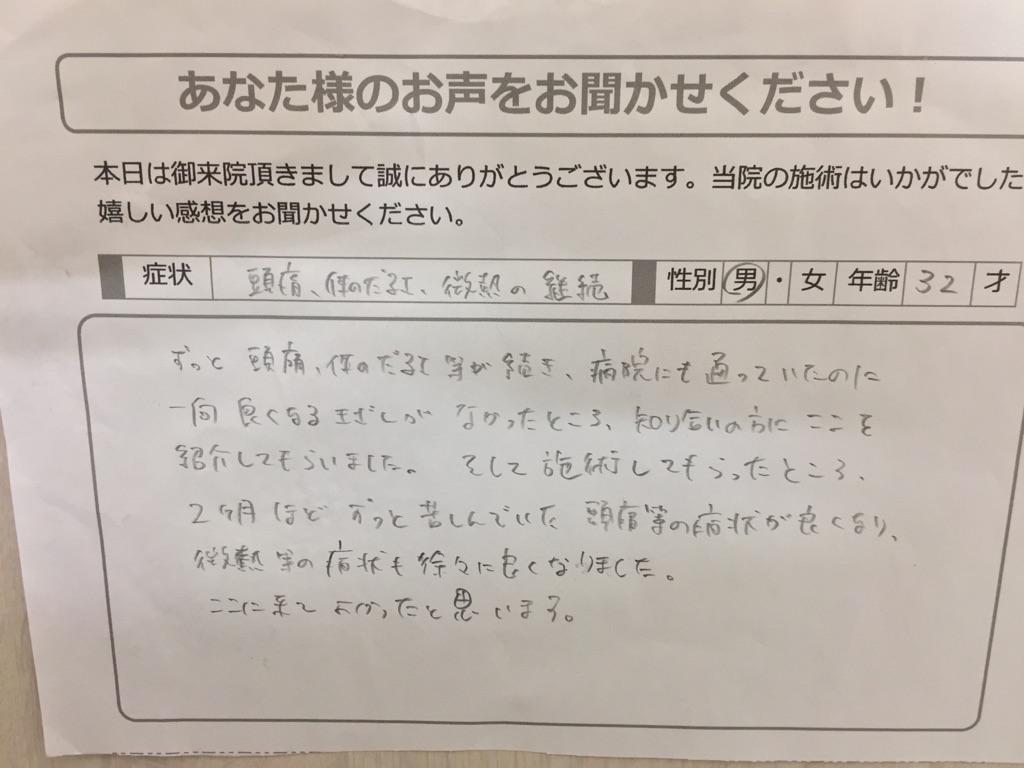 【頭痛、体のだるさ、微熱の継続 男性 32歳 】 ずっと頭痛、体のだるさ等が続き、病院にも通っていたのに一向に良くなるきざしがなかったところ、知り合いの方にここを紹介してもらいました。そして、施術してもらったところ、2ヶ月ほどずっと苦しんで... -