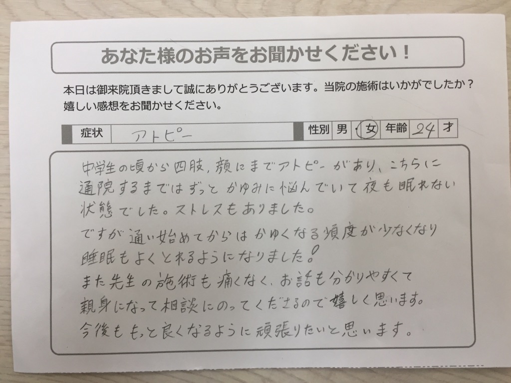 【アトピー 女性 24歳】 中学生の頃から四肢、顔にアトピーがあり、こちらに通院するまではずっとかゆみに悩んでいて夜も眠れない状態でした。 ストレスもありました。 ですが、通い始めてからはかゆくなる頻度が少なくなり、睡眠もよくとれるようになり... -