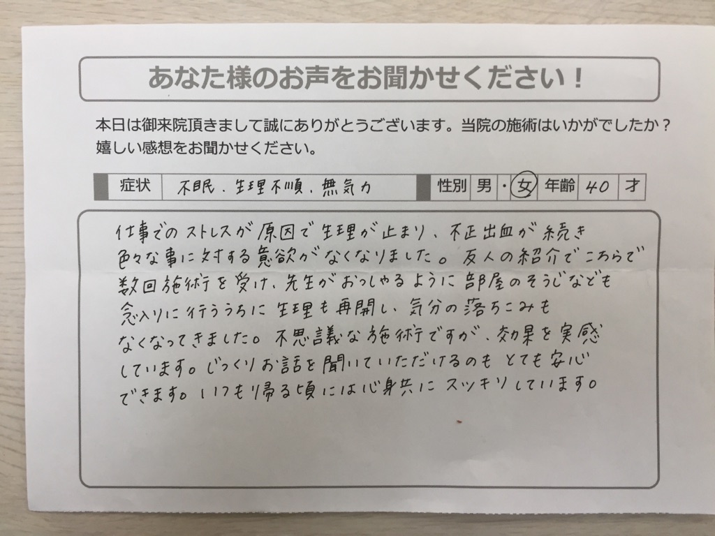 【不眠、生理不順、無気力 女性 40歳】 仕事でのストレスが原因で生理が止まり、不正出血が続き、色々なことに対する意欲がなくなりました。 友人の紹介でこちらで数回施術を受け、先生がおっしゃるように部屋のそうじなども念入りに行ううちに生理も... -